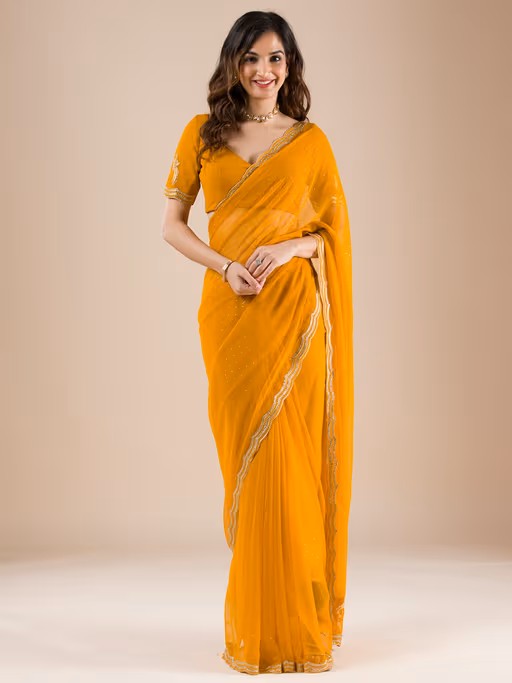 Step into grace with this Koskii Orange Stonework Chiffon Saree with Unstitched Blouse. Koskii ethnic sarees come with a blouse piece, which can be stitched according to your taste and preference, with this beautiful design and fabric, this saree will fetch you oodles of compliments and praise