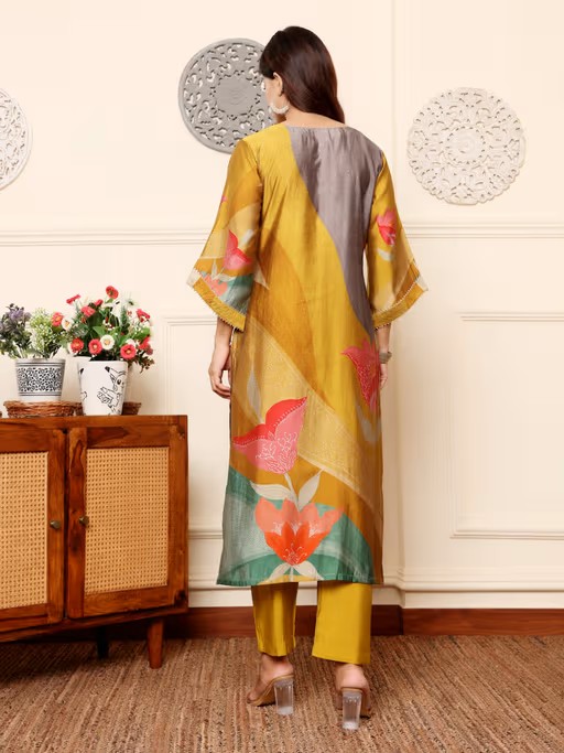 Content - 1 Kurta, 1 Pant Kurta: Fit-Straight Fit Color - Olive and Pink , Print and Pattern- Abstract Printed, Neckline - V Neck with Gotta Sleeves -3/4Th Bell Sleeves Length:- Calf Length Pant : Length - Ankle Length Pattern- Solid Fit , - Straight Waist- Elasticated Fabric - Silk Chanderi Olive Digital Floral Printed Style Trendy V Neck with Slit Kurta Set ,Crafted with Premium Chanderi Fabric, Fabric That Feels Like Feather To Your Body with Timeless Gota Detail , Which Give It A Very Royal and Premium Look Makes You Ready for Every Occasion and Day Wear Festivals.