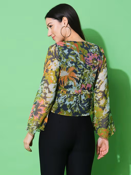 Leave the crowd spellbound by stepping out in this captivating green polyester normal fit floral top from Globus. Made from high-quality polyester, this piece features full sleeves and a v-neck. Style it with minimal jewellery and sandals to complete the ensemble.