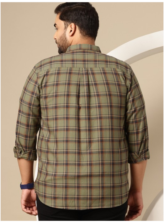 Olive green tartan checked opaque Casual shirt ,has a spread collar, button placket, 1 patch pocket, long regular sleeves, curved hem
