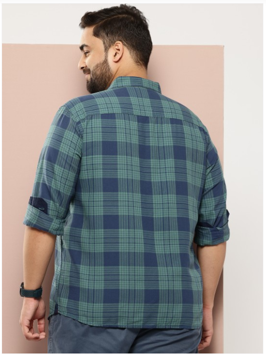 Blue checked opaque casual shirt, has a cutaway collar, button placket, 1 pocket, long regular sleeves, curved hem