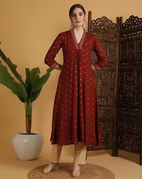 Printed Rayon Calf-Length V-Neck Semi-Flared Kurta