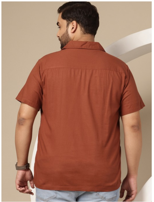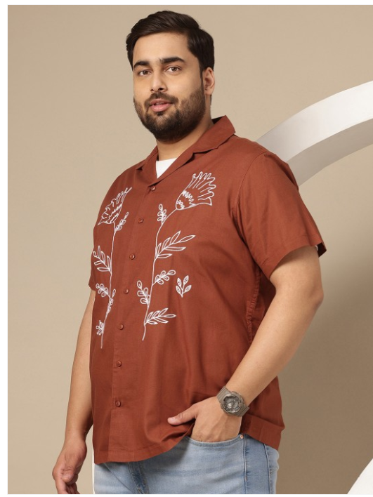Brown and white floral embroidered opaque Casual shirt, has a cuban collar, button placket, short regular sleeves, straight hem