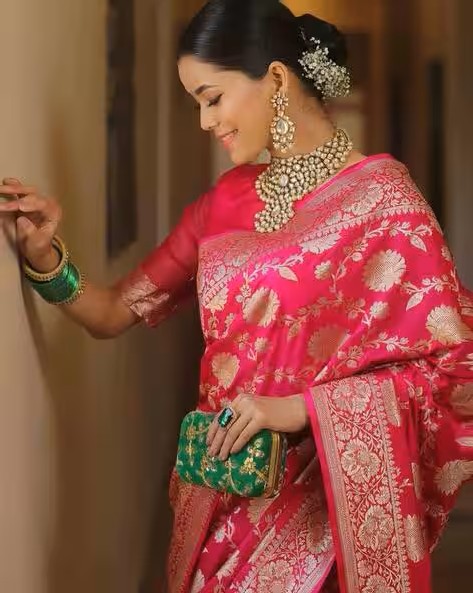 Banarasi Products are characterised by brocade borders & pallus. They often have woven butas or Jaal on the body. Luxurious weaves with an intense color scheme are their specialty, along with jewel-toned brocades, zari, quality silk, and lavish embroidery.This resplendent banarasi design is handpicked from skilled craftsmen and one of the finest in the country.