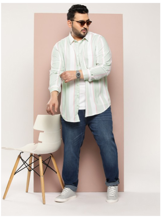 Green vertical striped opaque Casual shirt ,has a cutaway collar, button placket, 1 patch pocket, long regular sleeves, curved hem