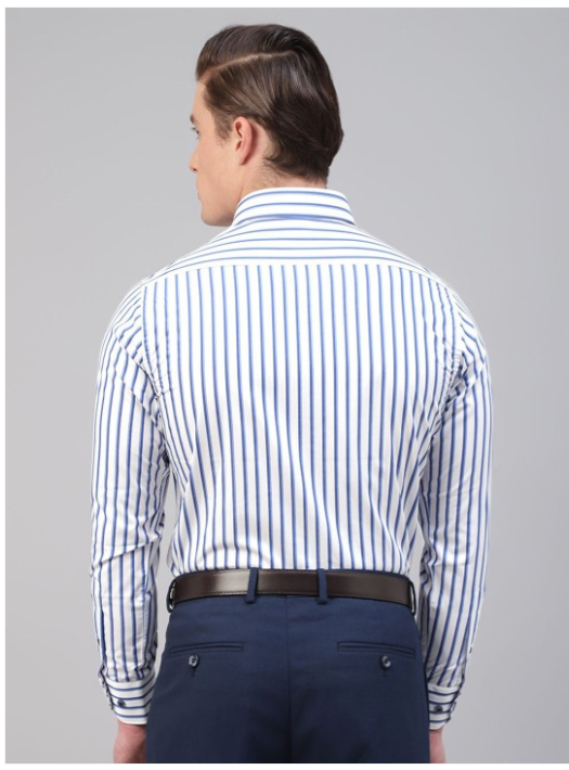 Blue vertical stripes striped opaque Formal shirt ,has a spread collar, button placket, 1 pocket, long regular sleeves, curved hem