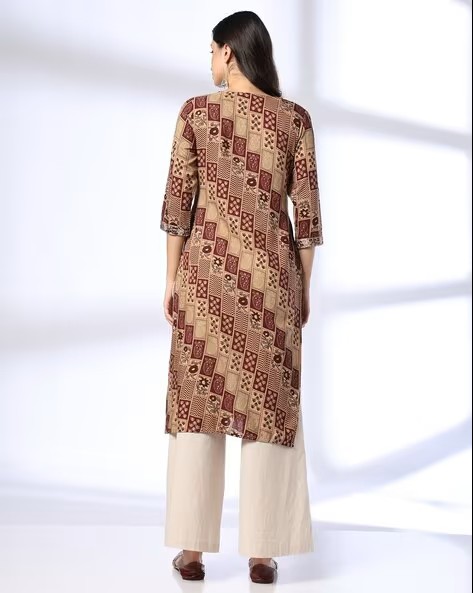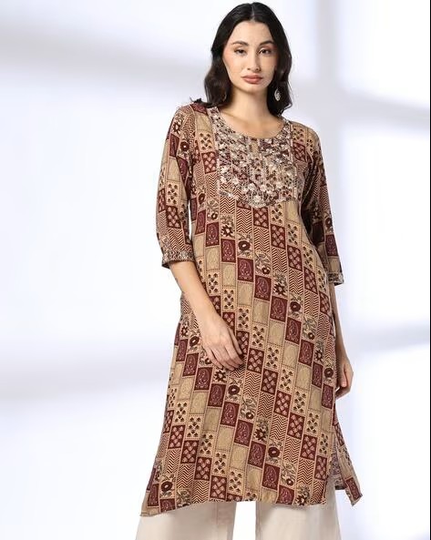 Women Geometric Print Straight Kurta with Embroidered Yoke