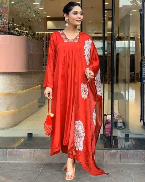 Elevate your ethnic wardrobe with this elegant women’s kurta set featuring a 45-inch straight-fit Chinon kurta with intricate embroidery, soft rayon pants, and a matching Chinon dupatta. Designed with a stylish V-neck, this 3-piece ensemble is perfect for weddings, festive occasions, and cultural events. Available in sizes S to 3XL, it ensures comfort, grace, and a flattering fit for all women and girls.