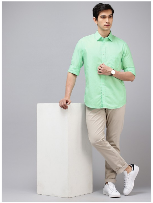 Green textured self design opaque casual shirt ,has a spread collar, button placket, 1 patch pocket, long regular sleeves, curved hem