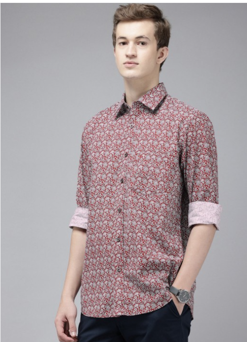 Maroon floral printed opaque casual shirt ,has a spread collar, button placket, 1 patch pocket, long regular sleeves, curved hem