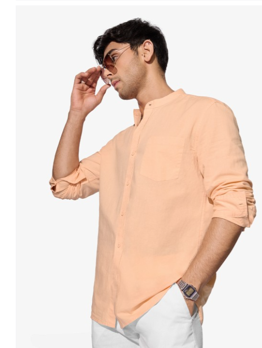 Peach-coloured solid opaque Casual shirt ,has a mandarin collar, button placket, 1 patch pocket, long regular sleeves, curved hem