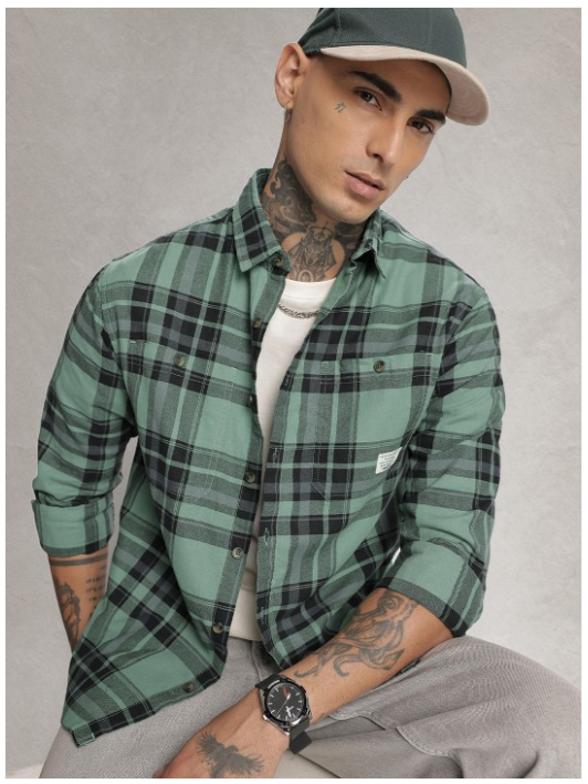 Green other checks checked opaque Casual shirt ,has a spread collar, button placket, 2 patch pocket, long drop-shoulder sleeves, curved hem
