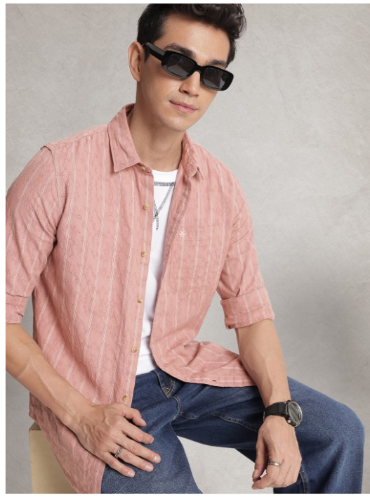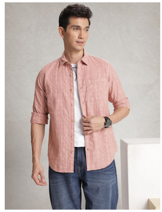 Rose vertical stripes opaque casual shirt, has a spread collar, button placket, 1 patch pocket, long regular sleeves, curved hem