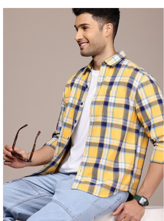 Yellow & blue tartan checks opaque casual shirt, has a spread collar, button placket, 1 patch pocket, long regular sleeves, curved hem