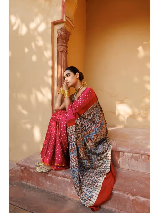 Step into grace with this Geroo Jaipur Magenta Pink Ajrakh Pure Bandhani Silk Saree with Unstitched Blouse . Geroo Jaipur ethnic sarees come with a blouse piece, which can be stitched according to your taste and preference, with this beautiful design and fabric, this saree will fetch you oodles of compliments and praise.