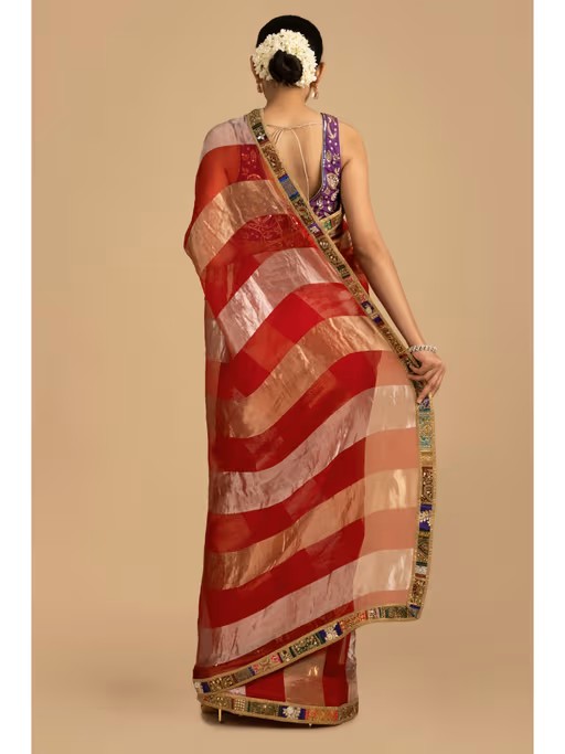 Detailed Gold Zari Work And A Luxurious Organza Silk Base Make This Banarasi Saree Popular Amongst Women. Designed With Current Fashion Trends, The Traditional Patterns, Vibrant Red Hue, And Elegant Finish Make This Masterpiece An Ideal Choice For Weddings And Events.