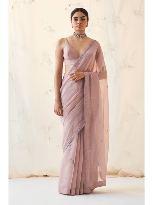 Indulge In Sheer Luxury with The Exquisite Lavender Shade Chanderi Saree Adorned with Hand-Crafted Leafy Jaal, Exuding Elegance. The Bralette Blouse Featuring Intricate Croatia Work On The Strings Adds A Touch Of Glamour, Making This Ensemble A True Symbol Of Sophistication and Opulence. Make A Statement with This Stunning Attire.