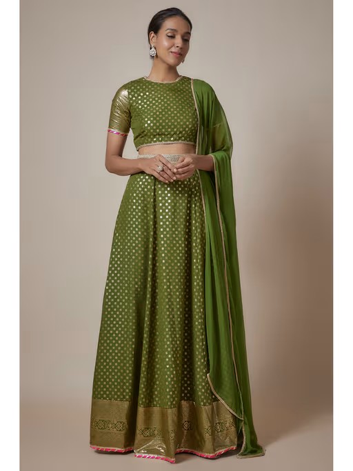 Breeze In And Out Of Festive Gatherings In Our Microfoil Print Lehenga Sets That Are Sure To Become Your New Favourite This Season. Crafted In 100% Recycled Polyester, This Ensemble Is Destined To Become Your Go-To Festive Staple, Allowing You To Effortlessly Pair It With Your Most Comfortable Footwear And Accessorize With Stunning Gold Accents. Like All Of Our Pieces, This Piece Is Made In India And Checked By Hand To Ensure High Quality. Styled With A High Neck Elbow Sleeve Printed Blouse In A 100% Recycled Polyester Base With Gota Edge Lace Details And Back Metal Zipper. Styled With Our Chiffon Dupatta With Lace Detailing.