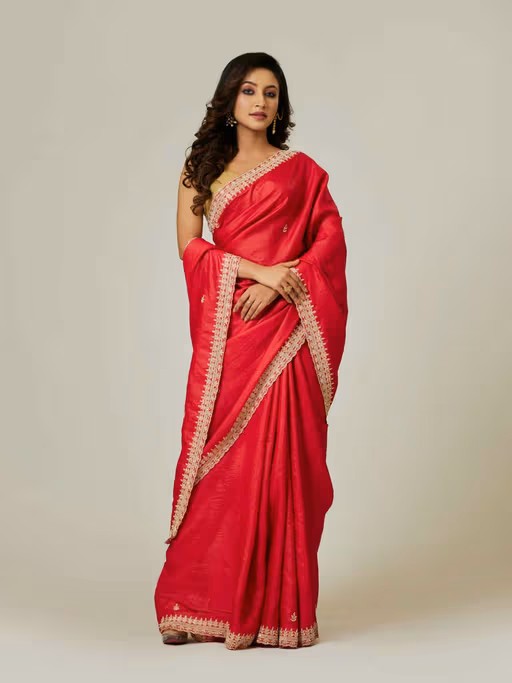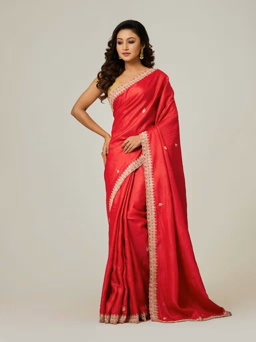 Add A Touch Of Luxury To Your Ethnic Wardrobe with This Vibrant Red Pure Tussar Saree, Beautifully Crafted To Showcase Traditional Craftsmanship. The Saree Is Adorned with Intricate Hand-Embroidered Dabka Work, Adding A Rich Texture and Shimmer To The Design. The Pure Tussar Silk Fabric Offers A Natural Sheen and Comfortable Drape, Making It An Ideal Choice for Festive Occasions, Weddings, or Cultural Events. The Meticulous Dabka Embroidery On The Saree Enhances Its Elegance, Creating A Timeless, Regal Look. Pair It with A Matching Blouse and Statement Jewellery To Make A Sophisticated and Graceful Statement.