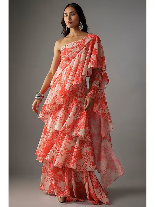 Embrace Effortless Grace In This Pre-Draped Pink Georgette Saree. The One-Shoulder Bustier Flatters Your Curves, While The Print From Our Boho Collection Adds A Touch Of Whimsy. Pre-Draped For Your Convenience, This Saree Is Ready To Make You Feel Like A Goddess.