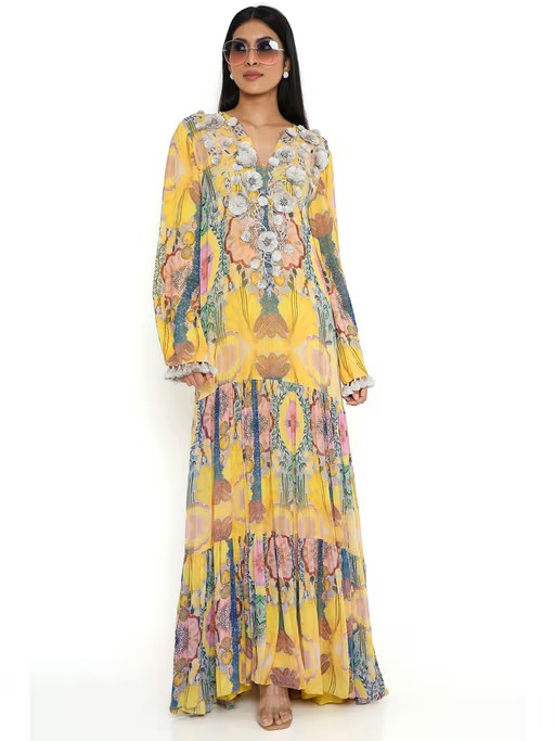 Yellow enchanted print embroidered yoke art georgette boho dress.Disclaimer :- Since we are a made-to-measure brand and our dyeing process and embroidery are handcrafted, there may be slight variations in the color and embroidery of the actual product. The color of the outfit might also slightly vary from what you see on your device's screen.The print placement may also vary from what is represented in the images shown on the product page.