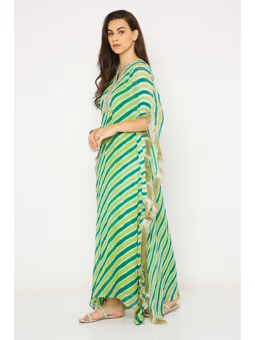 Green Leheriya Georgette Embroidered Yoke Kaftan Hand Embroidered Leheriya Kaftan With Gota Fringes.