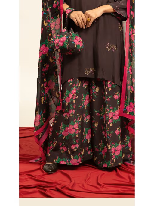 Experience The Perfect Fusion Of Comfort And Style With This Shetab Kazmi Brown Kurta With Sharara Pant & Dupatta. It Is Made From High-Quality Fabric. It Features Full Sleeves, V-Neck Kurta Style And Flared Mid Waist Pant Style. Ideal For Any Occasion, It Is Designed To Flatter With Ease And Sophistication.