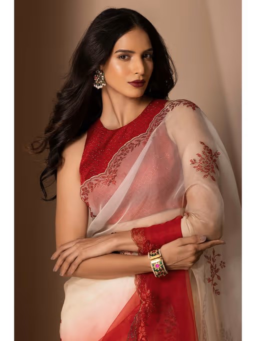An Ombre Soft Silk Organza Saree Adorned with Rhinestones and Scalloped Border, Paired with Red Crepe Crew Neckline Blouse with Rhinestone Embellishment. Fabric : Silk Organza (Saree) and Crepe (Blouse)Colour - Red