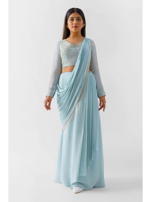 Adorn the styles specially made for you with this blue set from Suruchi Parakh. Made from high quality georgette, it features hook and eye closure and embroidered pattern along with full sleeves & round neck design. Pair it with trendy footwear to elevate your look.