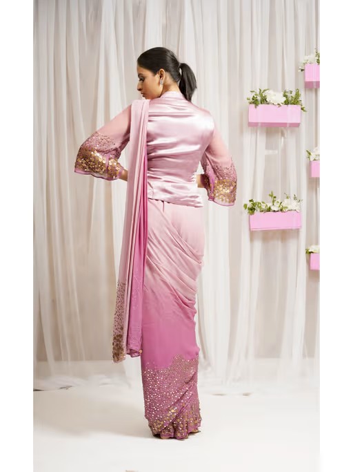 Elevate your look with this pink hand embroidered saree and stitched blouse set from FS Closet by Farha Syed. Crafted from blended fabric, the blouse is finished with bell sleeves and mandarin neck. Style this set with a pair of heels and statement jewellery to complete the look.