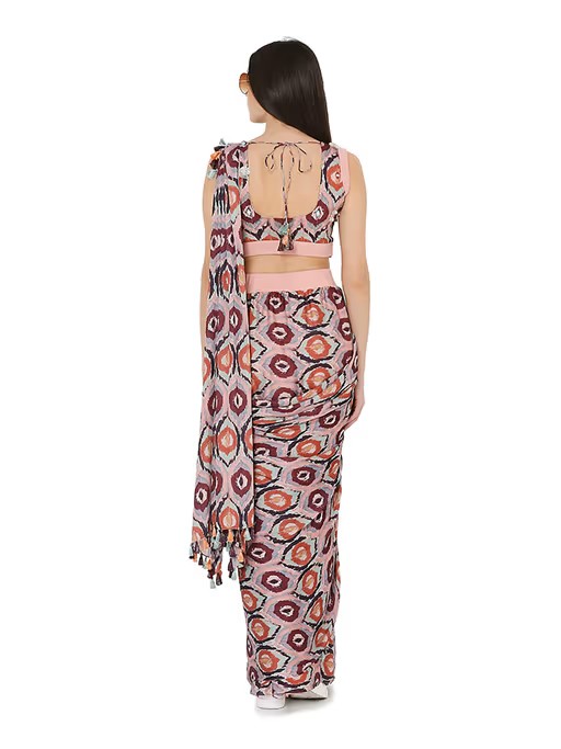 When an aesthetically pleasing silhouette meets a unique design, a power packed look is guaranteed. This exquisite red saree from PS Pret by Payal Singhal is sure to create the right amount of drama. Crafted in rich quality viscose, this artfully printed piece has been accented with attractive tassels and detailing at the rib to create a mesmerising outfit. The attached blouse piece features a round neck and the sleeveless design ensure you stay breezy and comfy all day long. Club with a pair of chandbali earrings to look your ethnic best.