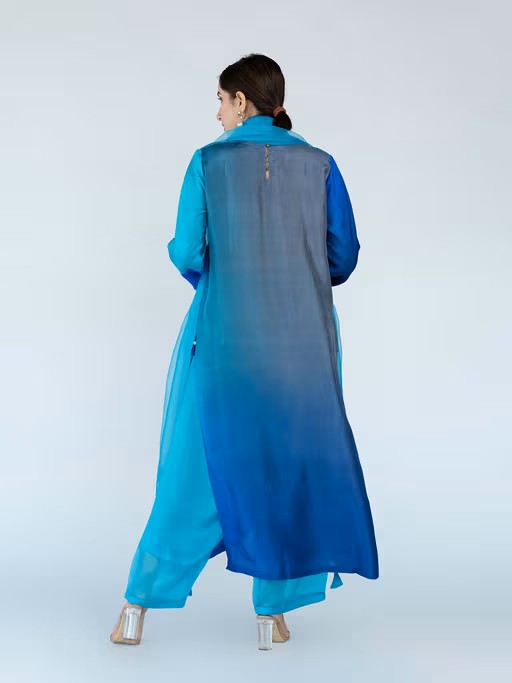 Add an ethnic touch to your wardrobe with this blue kurta, dupatta, pant from Meghna Panchmatia. Made from high quality silk, it features button fly closure and ombre pattern along with three fourth sleeves & round neck design. Pair it with traditional footwear and minimal jewellery to complete your ensemble.