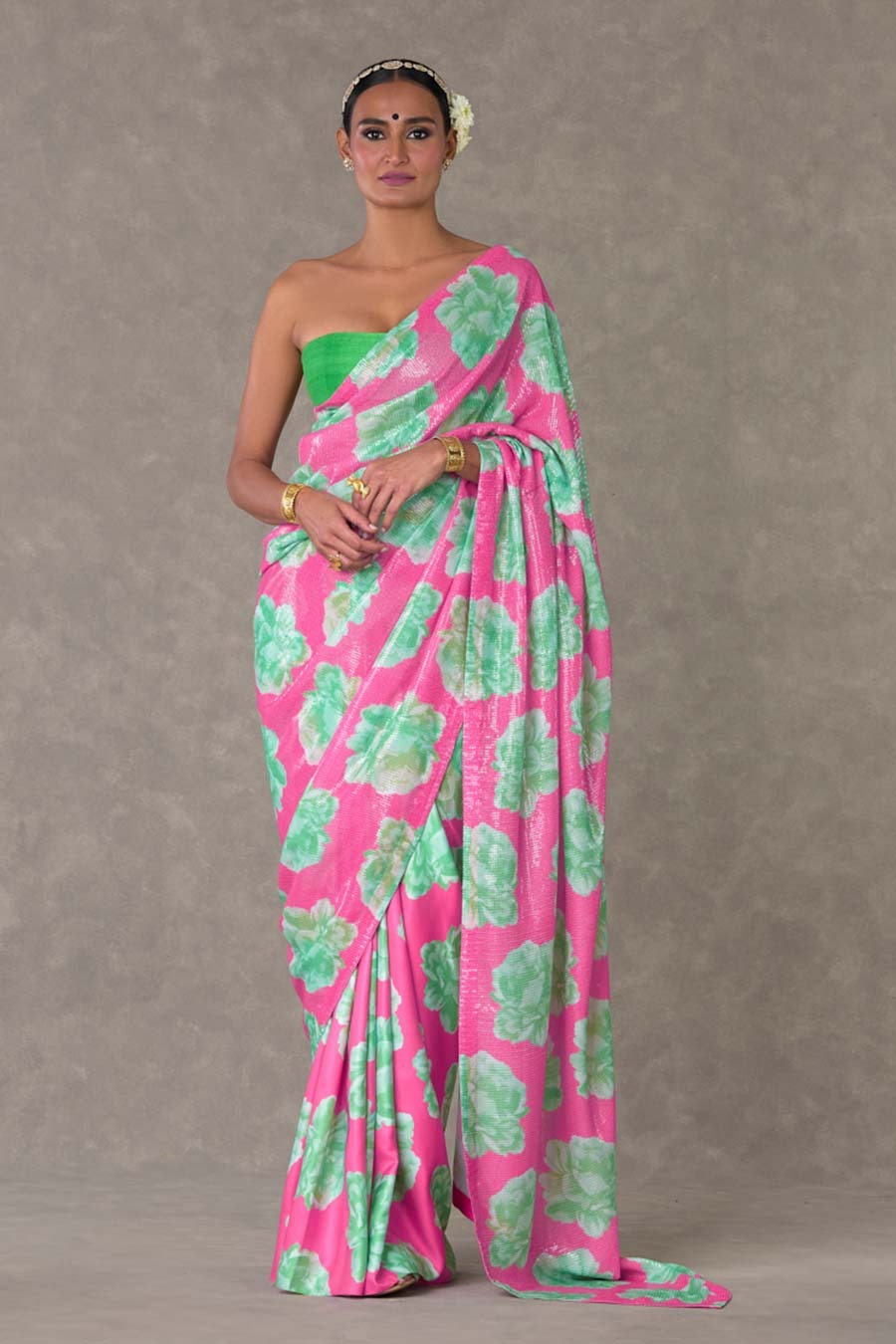 • Material - Saree - Sequinned Georgette and Silk; Blouse - Raw silk