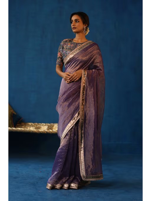 Adorn The Ethnic Hues With This Purple Saree Set From Begum Pret. Made From High Quality Silk, It Features Hook And Eye Closure And Embellished/Sequined Pattern Along With Hook And Eye & Half Sleeves Design. Pair It With Trendy Footwear & Minimal Jewellery To Complete Your Ensemble.