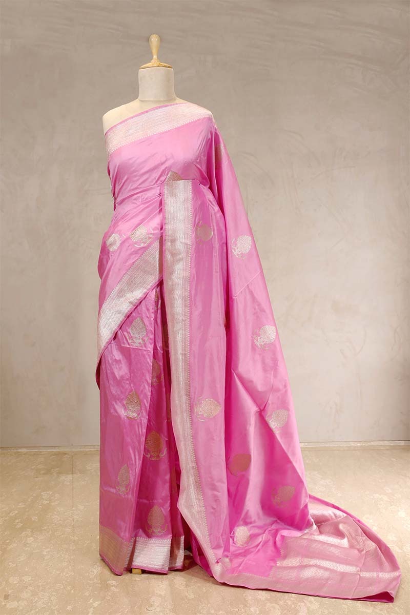 This baby pink Banarasi silk saree is handloom woven with gold and silver zari buta motifs across the base body of pure Katan silk fabric. The saree features a brocade-style woven zari border and pallu, adding a touch of sophistication. It is accompanied by a matching running unstitched blouse piece, perfect for custom tailoring.