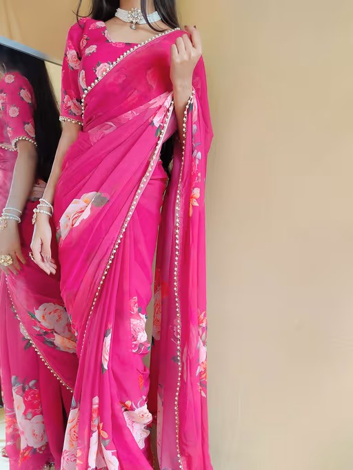 Step into grace with this LooknBook Art Hot Pink Georgette Floral Printed Pearl Lace Border Saree with Unstitched Blouse. LooknBook Art ethnic sarees come with a blouse piece, which can be stitched according to your taste and preference, with this beautiful design and fabric, this saree will fetch you oodles of compliments and praise.