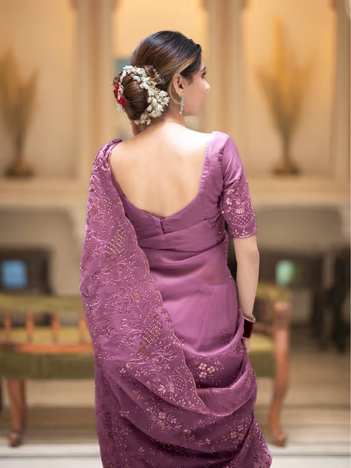 Channel your inner diva with this purple embroidery french silk saree with unstitched blouse from Zilikaa. Crafted from high-quality silk. This saree features an exquisite embroidered design. Style it with a pair of heels and diamond earrings for an elegant and soft look.