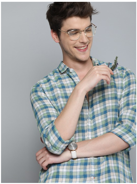 Blue and Green checked casual linen shirt, has a spread collar, long sleeves, button placket, and curved hem