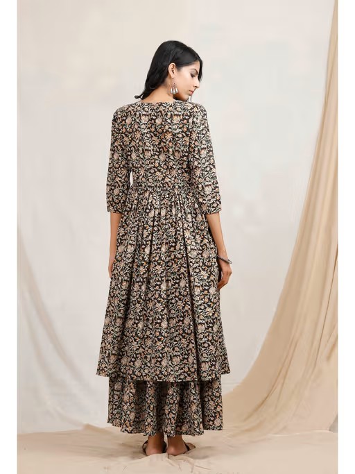 This black kurta is crafted in cotton and features a V- neck, 3/4th sleeves and printed detailing all over. Buy this kurta online and team it with flared pants and heels to create a trendy look.