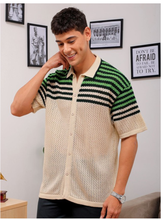 White, green & black striped opaque Casual shirt ,has a spread collar, button placket, short regular sleeves, curved hem