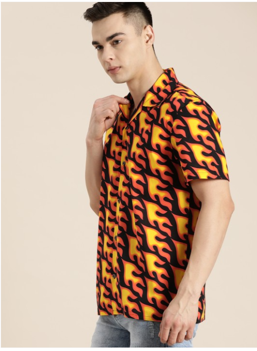 Yellow abstract printed opaque Casual shirt ,has a cuban collar, button placket, short regular sleeves, straight hem
