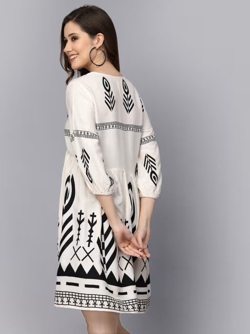 Rayon Tribal Printed Dress With V-Neckline And Flared Sleeves. Pair It With Casual Jewellery And Sneakers Or Flats To Flaunt Yourself. Products Length - 36" Inch.