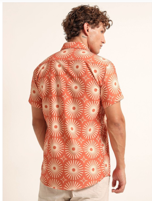 Orange floral printed opaque Casual shirt ,has a spread collar, button placket, na pocket, short regular sleeves, curved hem