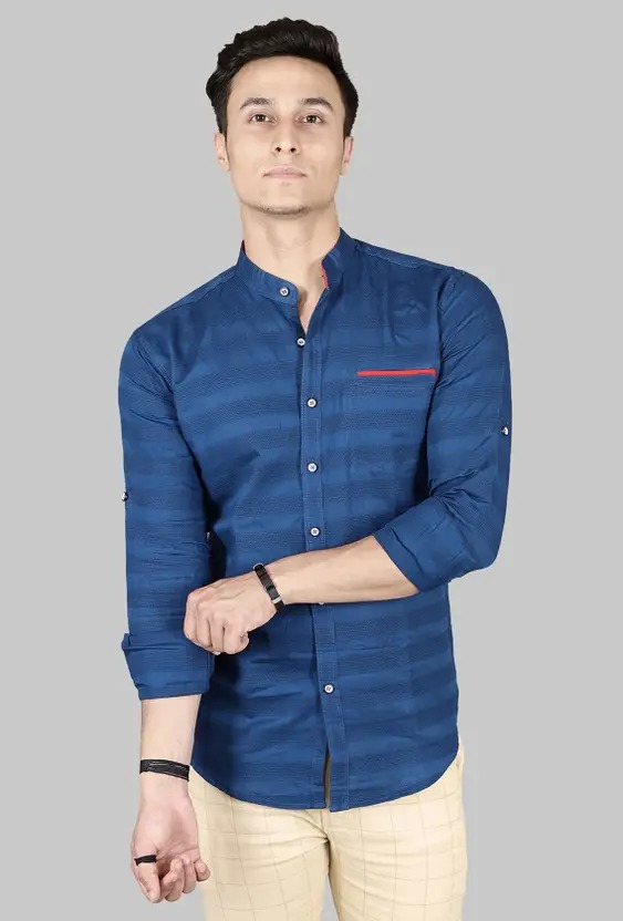 Men Slim Fit Striped Mandarin Collar Party Shirt