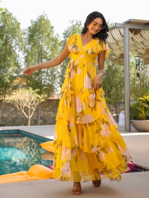 Bring The Sunshine In This Yellow Tulle Gown With Soft Floral Prints And Cascading Ruffle Tiers. Perfect For Destination Events And Statement Summer Moments.