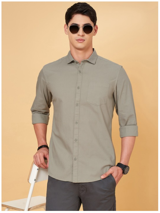 Green solid opaque Casual shirt ,has a spread collar, button placket, 1 pocket, long regular sleeves, curved hem