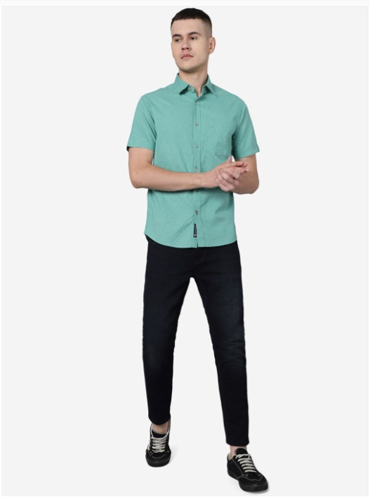 Green micro ditsy printed opaque Casual shirt ,has a spread collar, button placket, 1 pocket, short regular sleeves, curved hem
