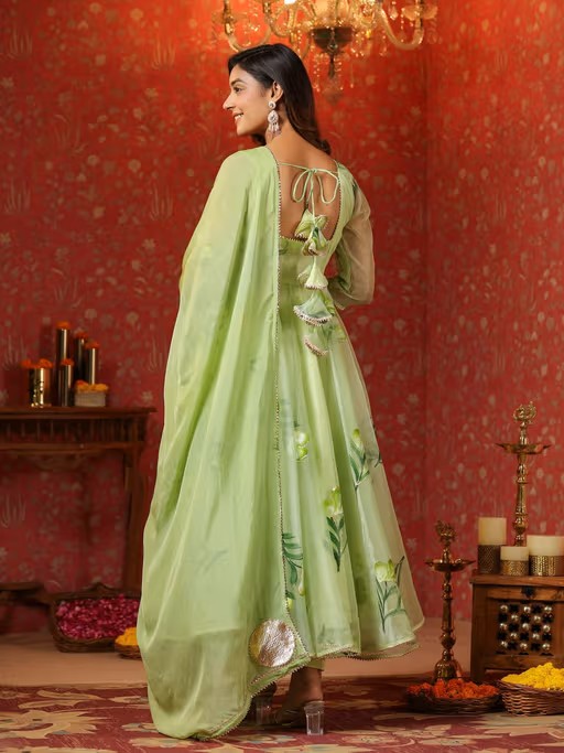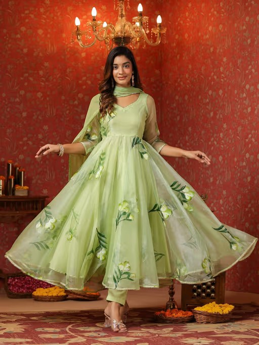 SamaayaJaipur Parrot Green Organza Brush Print Anarkali Kurta with Pant & Dupatta