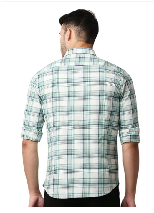 Green checked Casual shirt ,has a spread collar, button placket, 1 pocket, long regular sleeves, curved hem
