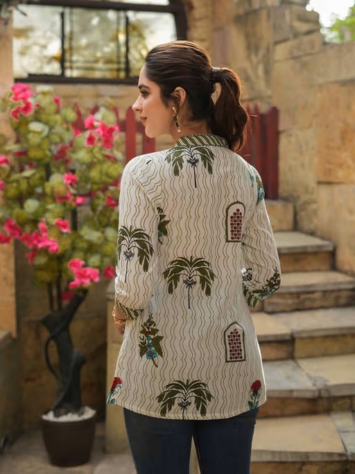 Effortlessly stylish, this Rain & Rainbow Women Green and Off White Floral Printed Pure Cotton Short Kurti blends classic charm with modern ease. It is crafted from high-quality fabric. It features three fourth sleeves, v-neck style. It's the epitome of understated elegance, perfect for festive, wedding, or special occasions.